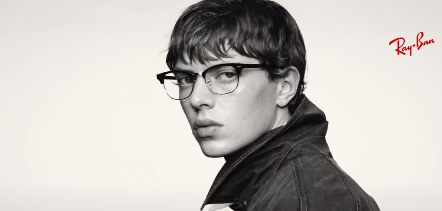 Two people wearing sunglasses and leather jackets with Ray-Ban logo, against red and yellow backgrounds.