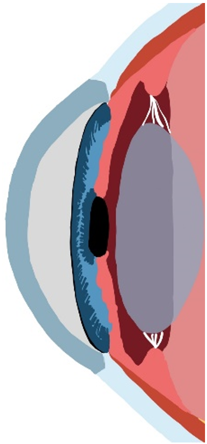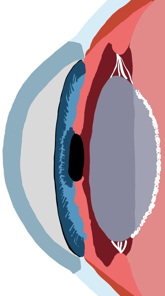 For vision to be in clear and in focus, light must pass through the cornea, the clear tissue at the front of the eye, the pupil, the black hole in the center of the colored iris, and the lens, the clear tissue inside the eye, to the tissue responsible for detecting light, the retina. The lens sits inside a bag (capsule) attached to strings (zonules) that are controlled by muscles (ciliary body).